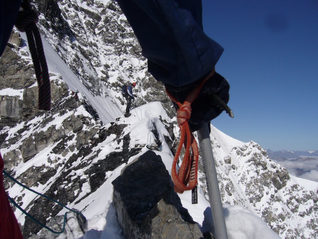 Lepší nejspíš je sestupovat normálkou. My jsme bohužel sestupovali opět po skalkách, takže jsme se museli komplikovaně vyhýbat ostatním vystupujícím. Druhá naše chyba (za kterou to zřejmě v diskuzi schytám) bylo to, že jsme šli ve čtyřech na jednom laně a rozhodli jsme se, že lano nahoře pověsíme na fix, ti méně zkušení tak nějak s pomocí lana sejdou nebo slaní (přičemž zanechají procvaknuté expresky) a ten poslední se potom přiváže na konec lana a celé to sejde (dole někdo bude lano přidržovat, kdyby něco; jinak na písku občas vylezu i VII a někdy i s písmenkem, takže tohle bylo realizovatelné). To byla ale pěkná blbost! Je to takové zvláštní, když slézáte přivázaní na lano a o dvě expresky níže chce po stejném laně nějaký Angličan žímarovat nahoru. Takže příště žádné vlastní fixy, všechno jistit pokud možno průběžně a nerozmotávat více než cca 10 metrů lana. Nevšímejte si toho, že guidi (bergführeři, horští vůdci) táhnou ovce (klienty) na velmi krátkém laně (max. 3 metry), oni tam to lano nemají pro svoji bezpečnost nebo jištění, ale proto, aby mohli táhnout platící ovce.