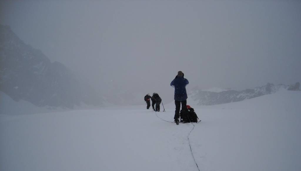 Výstup z ledovce nahoru na hřeben byl téměř čistě po sněhu (začátek července), v dolní časti ze sněhu koukaly fixní lana. Nejvýhodnější bylo sbalit lano, vzít do ruky druhý cepín a cupitat ve sněhu se dvěma cepíny strmým sněhem přímo nahoru na hřeben. Pár metrů po hřebínku okolo fixních lan ke skupince křížků a pomníčků. (Destičku tam má i nějaký pan Kučera.) Odtud slanit (nejlépe od nejmasivnějšího křížku) cca 10 metrů do sedla, ale lze to i slézt. Bylo cca 8:30, žádná sláva. V sedle Festijoch jsou dvě možnosti: buď dále po hřebeni Festigrat nebo zahnout na druhý ledovec a dlouhým obloukem okolo séraků a svahem nahoru. Počasí v sedle nebylo nic moc, trochu sněžilo, foukalo, výhledy také nic moc, do Festigratu se nikdo nehrnul, dvě dvojice šly po ledovci. Tak jsme šli za nimi. Čím jsme byli výše, tím horší bylo počasí, chvílemi by se dalo hovořit o vánici. A tak jsme získali další dvě zkušenosti. První zkušenost je, že i když jste podle výškoměru cca 200 metrů pod vrcholem, tak pokud chce jeden jít dolů, tak se jde dolů. Nemá cenu vymýšlet varianty typu: "Počkej tady, za půlhoďky jsme zpátky." Tomu čtvrtému je stejně jasné, že to bude v hospodě u piva zbytek roku poslouchat, takže asi fakt chce dolů. A druhá zkušenost je, že když jdeme ve čtyřech, tak není od věci mít dvě lana, i když na ledovci jdeme navázaní pouze na jednom. Lze tak v případě sporu nebo probl0mu rozdělit čtveřici na dvě dvojice bez řezání lana. No nic, aspoň jsme "obhlídli nástup".
