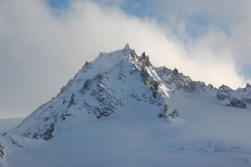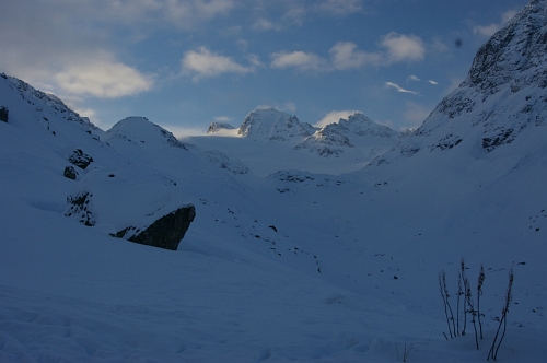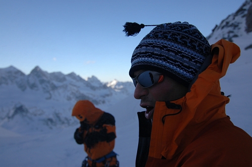 Zima ráno řádně zalézala za nehty. Bylo zataženo, lehce sněžilo. Ostřejší tempo bylo tak trochu vysvobozením. Na ledovci jsme se navázali, protože přeci jenom v toto roční období sněhová pokrývka ještě zdaleka není dostatečná a sněhové mosty pevné. V našem směru žádná stará stopa nešla vidět. Na ledovci je pouze jeden výraznější schod se sklonem okolo 20°. Do sedla Urezzajoch 2.906 m to tak nebyla žádná hrůza. Stáli jsme v něm za 3 hodiny. Oblačnost však klesla přímo na nás, mrazivý vítr doprovázelo sněžení. Nebylo o co stát pokračovat dále. Sjezd byl fajn.