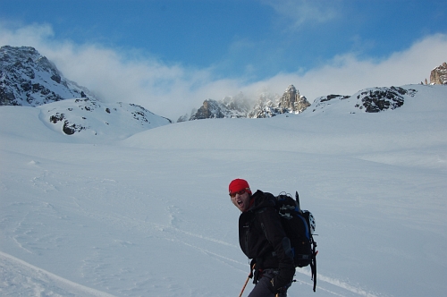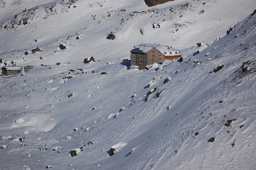 Odpolko jsme sápli brdek Steinmannli 2.353 m nad chatou, abychom okoukli sněhové podmínky. Sněhu bylo spíše méně a rozhodně tady nenakydalo tak móóócka jako třeba ve Slovinsku a v jižním Rakousku. Místy větrem utemovaný prašan, jinde slušná krusta nebo zmrzlá ledová deska. Prostě všehochuť. Na vyfoukaných místech bylo třeba koukat i na kameny. Kosa byla jak cip a do toho větrno. Rychle zpět do tepla chaty!