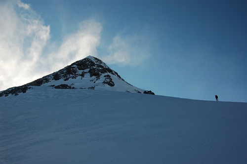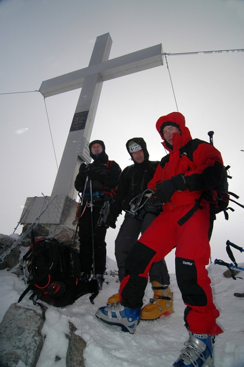 O dva dny později jsme zde byli zpátky. Už bez navázání, ne že by se sněhová pokrývka nějak výrazně změnila, jsme došli téměř pod sedlo Urezzajoch, odkud jsme ledovec šikmo traverzovali směrem do sedla Jamjoch 3.078 m. Mezi Vordere a Hintere Jamspitze nás překvapil poměrně prudký výšvih (cca 30°), který ve špatných sněhových podmínkách může představovat lavinové nebezpečí. Tady se opět slunko schovalo za mraky. Ze sedla to bylo na vrchol co by kamenem dohodil. Na lyžích jsme došli až pod vrcholový kříž. Zima s větrem žádnou delší vrcholovou siestu neumožnila.