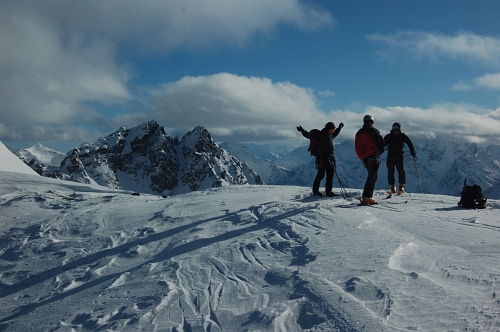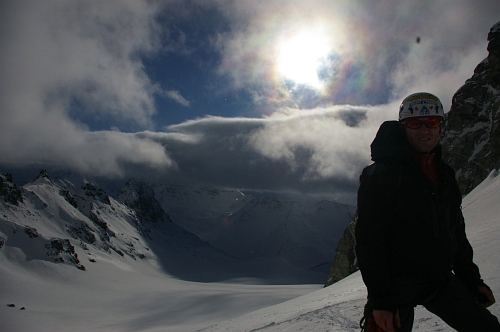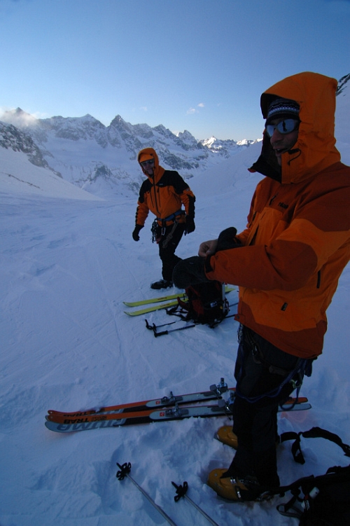 Čelda s Kamilem si den ještě zpestřili krátkým sjezdem na švýcarskou stranu, obešli Gamsspitze 3.114 m a ledovcem pod ním sjeli dolů. Risk se jim vyplatil, na švýcarské straně se počasí vybralo.