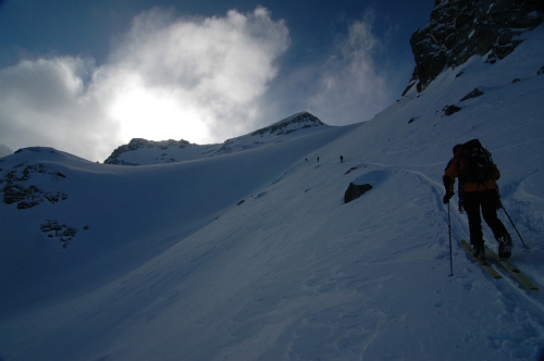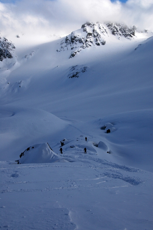 Po neúspěšném pokusu o nějaký kopeček nad sedlem Urezzasjoch první pobytový den jsme vybrali právě tento cíl pro krátké odpoledne. Přetraverzovali jsme ledovec Jamtalferner přímo pod sedlo a nenápadným hřebínkem jsme pohodlně vystoupali pod západní stěnu Tiroler Kopf. Stopa již byla z rána šláplá. Nenechali jsme se ji však zcela unést, protože ledovec do sedla je řádně příkrý, sklon v linii výstupu 30 – 35°, v linii sjezdu i s úsekem kolem 40°. Zbyňa udělal sondu, sníh byl řádně utemovaný, bez vyloženě nestabilní vrstvy. V bezpečných vzdálenostech jsme prostoupili strmější metry. Čím blíže jsme sedlu byli, tím více foukalo. Až nechutně moc. Dělali jsme si zálusk na Ochsenkopf, ale vítr se sněžením nám v tom zabránili. Zbývajících 100 výškových metrů výstupu od východu nevypadalo úplně zadarmo. Možná je výstup z druhé strany snadnější.