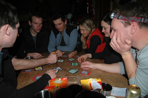 Na místě už byla vícečetná švýcarská a máločetná česká osádka, která měla v úmyslu hned zítra chatu opustit. Že by to bylo našim příchodem? Je sice pravdou, že někteří nejmenovaní jedinci (Že Stando?) na tom svými zvuky a pachy a zejména českou němčinou začali hned od začátku intenzívně pracovat. Oficiálně je zdejší Winterraum pro 12 osob, tomu odpovídá i počet přikrývek. Prostě šest těl dole a stejný počet na horní palandě. Speciálně rozepisuji pro některé české individua, která nezvládla základní počty. Pětihvězdičkový luxus doplňují kamna s dostatkem dřeva, samozřejmě stůl s lavicemi a židlemi a nějaké nádobí se taky najde. V krizi je možné uložit se do kůlny. Celá ta sranda přijde na 6,50 E za noc. Je zde však technický problém s placením. Dříve tady bývaly složenky. Ty tady při naši návštěvě nebyly a kasička chyběla. Všichni jsme se shodli, že právě pouhá přítomnost kasičky by stačila, abychom tady nějaké to Euro nechali. Zjistit číslo bankovní účtu od chataře a společně mu převést finance by byla taky možnost, ale podstatně komplikovanější.