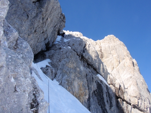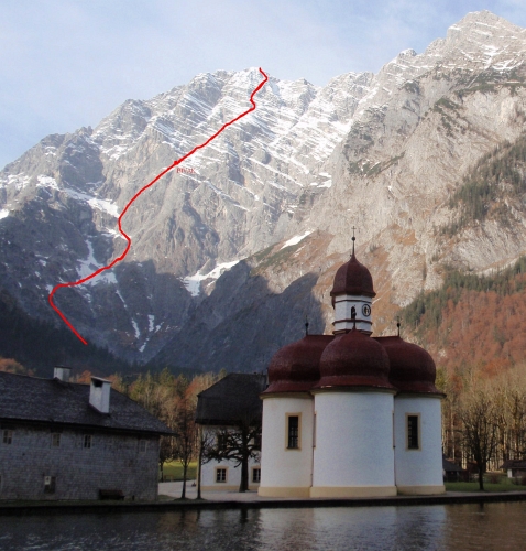 Nakonec tedy místo na páteční přednášce pana Messnera na Smíchovském festivalu alpinismu sedím za volantem a upalujeme si to směr Königsee. Po krátkých oplétačkách na parkovišti s místní policií si zjišťujeme přívoz do ST. Brtholomä, 9:55. Docela pozdě, ale co se dá dělat. Kolem dvanácté hodiny již stoupáme vyšlapanou pěšinou strmou klečí do pásma prvních lehkých skal berchtesgadenské cesty. Šikmo traverzujeme středové sněhové pole se zbytky laviny a pokračujeme dál pravým kuloárem na jehož vrcholu překonáváme druhé sněhové pole. Rozměry podstatně menší, ale co do sklonu dá již více zabrat. Časově jsme na tom dobře, a tak některé následující obtížnější pasáže podél stěny Wasserfallwand pro sichr odjišťujeme.