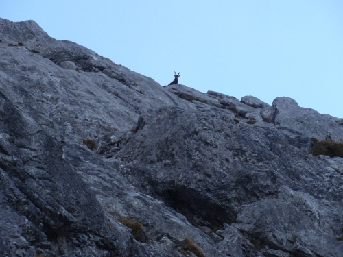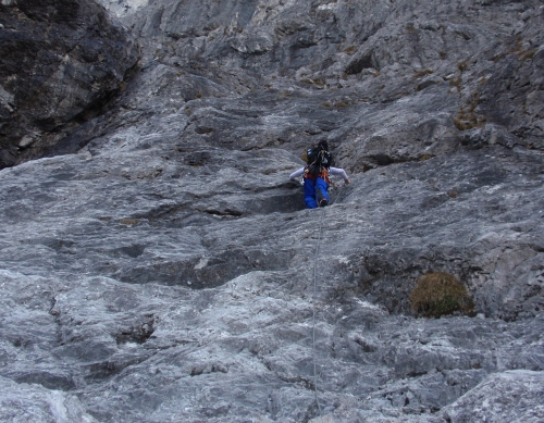 Buky mě zásobuje sprškou kamení, a tak schytávám hned jednu ránu do přilby. Volám na horu, ale odpovědí mi jsou dvě další bolestivé rány do kolena. Raději tedy mlčím a kryju se, protože kanonáda nepřestává. Následuje krátký sníh a po chvíli cesta uhýbá soutěskou doprava. Terén je okolo obtížnosti dvě, takže se jištěním nezdržujeme. Dnešní cíl je vylézt k bivakovací jeskyni přibližně v půlce stěny. Cestou potkáváme kolegu kozorožce, který nás již dobrou hodinu vytrvale shora pozoruje a ani naše bezprostřední blízkost ho nevyvádí z ledového klidu. Je obdivuhodné, kam až se tyhle zvířata dokáží vydrápat.