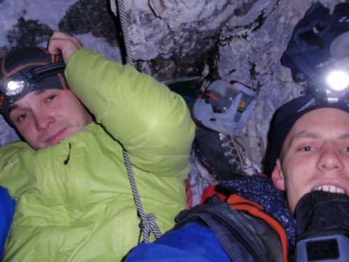Cirka ve čtyři hodiny k jeskyni konečně dolézáme, ale raději se schováváme pod rozměrným převisem asi deset metrů pod ní. Místa je tam dost, sníh na tavení hned vedle, v noci teplo, a tak si bivak náramně užíváme. Druhý den pokračujeme v původním směru. Hned ale nazouváme mačky a něco nám říká, že už je nesundáme. Přelézáme další sněhové pole a už si to valíme dvojkovým žlebem nahoru. Skála je ale až na krátké výšvihy pod strmým sněhem, a tak je to spíše lopota. Vybíráme si koryta po dřívějších lavinách, kde je sníh podstatně tvrdší a snažíme se postupovat co nejrychleji, protože se stěna začíná oteplovat a sníh se bořit.