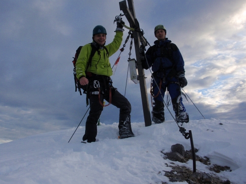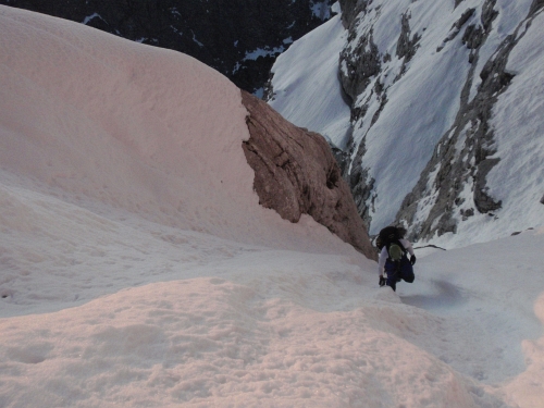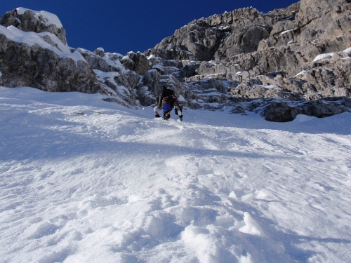 Přelézáme několik morálových ploten pokrytých sněhem a konečně vidíme bivakovací boudu, kde házíme rest. Čtyřista metrů je dnes za námi, třistapadesát k vrcholu nás ještě čeká. Je teprve půl desáté, a tak tavíme sníh na doplnění tekutin a po čtyřiceti minutách pokračujeme dál. Sníh se ale nepříjemně vertikalizuje a místy to odhadujeme na minimálně 60°. Naštěstí leží celou dobu ve stínu, takže je to vesměs příjemné polezení po tvrdém. První skály nás však brzy prověřují, a tak se začínáme jistit. Terén se výrazně ztěžuje a již víme, že dosud to byl jen takový čajíček. Směr výstupu je naštěstí snadné odvodit, a tak se nezdržujeme s hledáním trasy. Výšvih střídá žleb, komín strmá stráň a mě začíná pomalu docházet morál. Díky promočeným rukavicím musím na každém štandu bolestivě rozmrazovat ruce a říkám si, že příště už jen v goráčích. S ubývajícím časem nechávám vedení jen na Bukym, který je na tom v danou chvíli o poznání lépe. Posledních 150 metrů bylo tedy již v jeho režii a popral se s tím na jedničku. Jsme v klíčové délce cca 70m pod vrcholem. Obtížnost 3+ pokrytá sněhem je problém, ale větší  problémy dělá odlez od konce výšvihu do následujících strmých sněhových pasáží. Všechno se boří občas jen tak tak že člověk ještě postupuje. Třiceti metrové odlezy v těchhle sr....ch nejsou nic příjemnýho a já jsem rád, že v tom nemusím vyvádět.