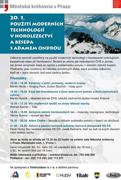 20.1.2010 je připraven v městské knihovně v Praze odborný seminář Použití moderních technologií v horolezectví a beseda s Adamem Ondrou Seminář je určen jak pro širokou veřejnost, tak pro instruktory ČHS či James jako kurz k rozšíření vzdělání.
