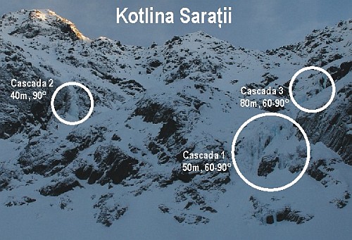 Nejvýznamnější ledovou oblastí Fagaraše je kotlina Saratii (směrem na horu Negoiu), která má tři ledopády. Dolní je dlouhý asi 40m a najdeme jej nedaleko letní turistické značky. Tento vodopád může sejít bokem dolů sněhem a po stranách najdeme položenější terény pro nácvik, nebo když je teplo (jednou jsme zde lezli v plus 7 stupních). Následuje mnohem větší, střední ledopád, který je se svými 90m výšky a stejně takovou šíří nejlepším terénem v dolině. Horní vodopád vlevo nahoře je nejtěžší, i když má asi 40m. Sestup z něj je pouze slaněním. Přístup do kotliny Saratii je kapitolou sama o sobě. Asi kilometr se od chaty postupuje traversem skalních stěn s chodníkem, který je vyspraven ocelovými lany a lávkami. Pokud je sněhu opravdu hodně, je postup pomalý. Jakmile se však cesta prošlape, zkrátí se doba cesty pod ledy ze dvou hodin na 40 minut.