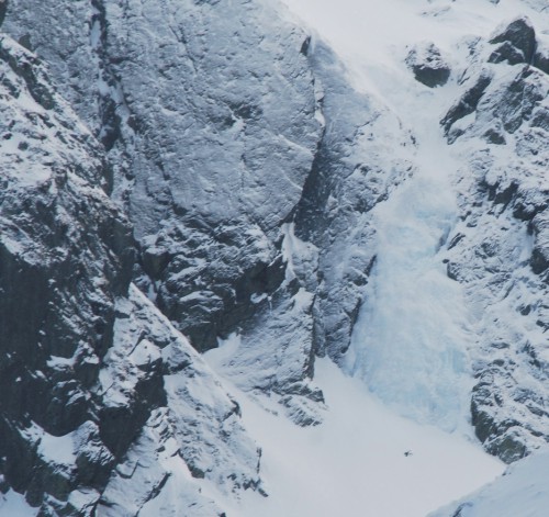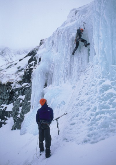 Na rozlezení si dáváme lehčí kousky položených ledů tak, abychom zjistili, jaký led je a jak vypadá jištění nahoře. Nad ledem svah volně přechází do sněhu, proto je nutné na posledním úseku ledu zbudovat štand ze dvou šroubů a smyčky. Postupně natahujeme vedle sebe čtyři cesty, na kterých se dosytosti vyřádíme. Najdou se zde i desetimetrové kolmé úseky, kde je vrtání šroubů z lezecké pozice opravdu zážitek. Pokud na všech lanech někdo visí, vypadá to zde jako na umělé stěně. Dvojice prostě jen přechází mezi zajištěnými cestami a buší jeden led za druhým.