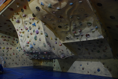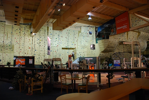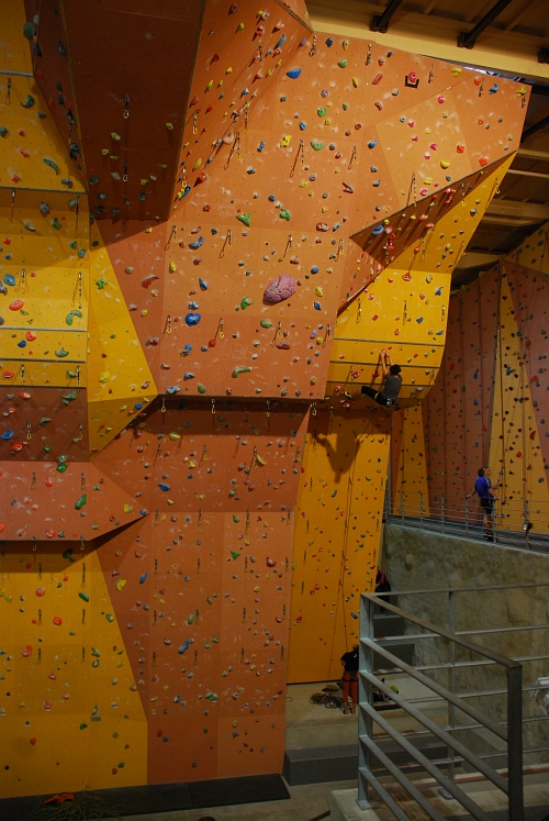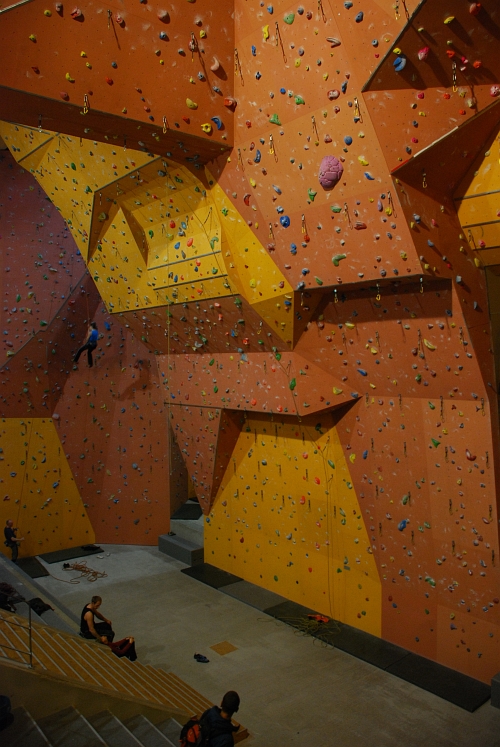 Nejdříve se nám zjeví zasklené sqash kurty, ty mineme a již se otevře pohled do obrovské, i když stále poněkud nízké sportovní haly. V jejímž centru jsou palubkové kurty a také rozsáhlé fitness centrum. Po stranách už vidíme stěny. Nejdříve je nízká boulderovka a pak stále celkem nízká kolmá stěna s navazujícím již vyšším bubnem slušných převisů, ale stále asi jen 10m vysokých.