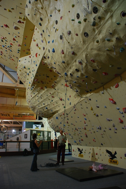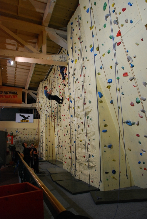 A již naproti vidíme i druhou stěnu, zdá se, že je širší a je tam i větší cvrkot. Aha, tak takhle to je. Ano stěna je skutečně velká, protože její návrháři ji zapustili do země. A to o dobrých 7 m. To znamená, že v kohoutku by mohla mít kolem 15m. Oficiální info hovoří dokonce o 16m výšky a 1000m² lezecké plochy. A že prý je zde cesta i 35 m dlouhá (to nevím kde, asi nějaký grand traverz).