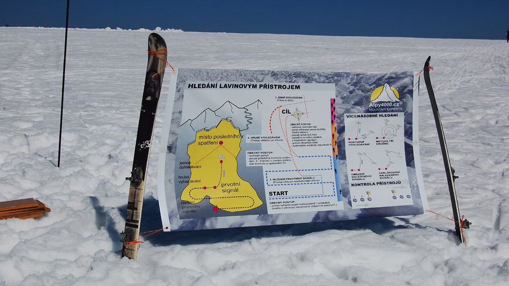 - jednotlivci - hledání lavinovými vyhledávači na čas, nasondování krycích desek (plocha do 100 x 150 m, hloubka zasypání do 1 m)
