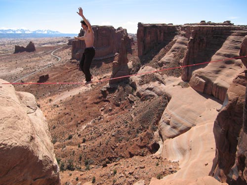 Dean Potter je také mistr v chůzi na slacklinu nebo přesněji highlinu. I zde se pohybuje na hraně a s ladností přechází bez zajištění vysoko nad zemí.