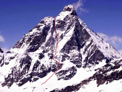 Linie cesty Couloir dell’Enjambée, jižní stěna Matterhornu,