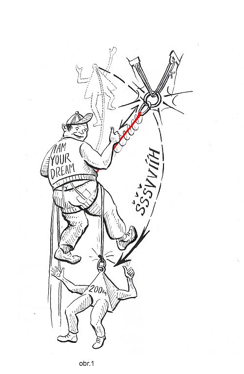 - V odsedávací dynamické smyčce byste měli mít karabinu s pojistkou a pevností minimálně 22kN, jako v kterékoli jiné odsedce. Odsedku je možné pojistit si lanem, nebo další smyčkou s průvěsem, ale není to nutné. Pokud by to nutné bylo, museli byste pak také redundovat centrální karabinu, karabinu v jistítku apod.