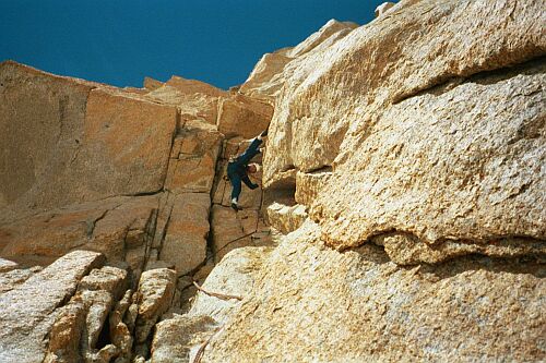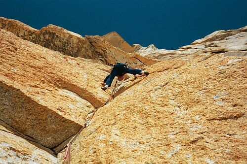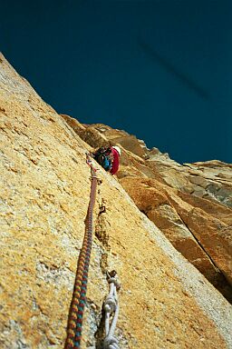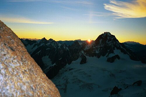 Vstávání ve čtyři hodiny netěší nikoho, zvláště když venku mrzne, ale obloha byla jasná, vše jsme prodiskutovali již dříve, tak vyrážíme. Okrajová trhlina, která nás před třemi lety strašila, byla teď bez problémů a my pokračujeme asi 100m kuloárem o sklonu 45  k vlastnímu nástupu, kde necháváme plastiky, mačky a cepíny. Právě vychází slunce.