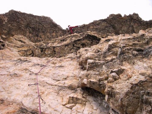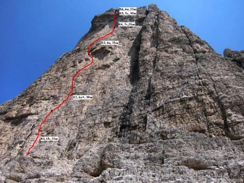 Jenom pro doplnění. Cesta vede v západní stěně Cima Grande a v průvodci se o ní píše: "Cesta rieši problém centrálnej časti steny - zónu previsov, ktoré obchádza Dülfer zprava a Stösser zlava. Týchto 300 m si od autorov vyžiadalo 4 dni lezenia a 70 skob, ktoré v stene zanechali. Kvalita skaly je zlá." Hmm.