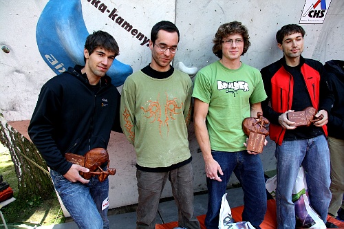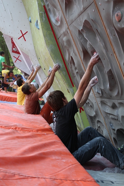 Krutá síla a dynamika byla předpokladem k úspěchu mezi muži. Boj a selekce hned na první boulderu. Vinná stezka = druhý kousek k snědku a topinka ve veltlínských hroznech – ukázala medailisty. Hroznový chyt osahali mnozí ale jen tři udrželi, zbytek se alespoň trochu prolétl, parádní podívaná. Problém číslo 3 a nepobratelná redukce na záchodovou mísu (nebo popelník) a předposlední drsná neberoucí lišta vytrápili každýho finalistu. Zónu ve třetím boulderu pokosili všichni a pak už jen pády a lety, až na budoucího vítěze – parádičku v tahu do topu předvedl Martin Stráník (skoro jako výsměch ostatním – hey kluci jste slaboši, nebo něco jako „I am basically weak“). Čtvrtý boulder hard core do zóny jak sviň, pouze pro bílé a první dva.