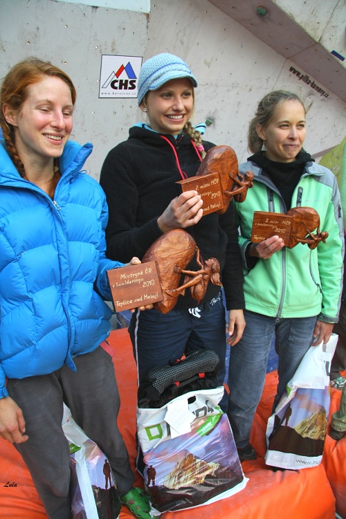 MČR není zábava ale hard core a oddělování siláckých zrn od zrn, pro plevy není místo. Přesto si v kvalifikaci slušně zalezli skoro všichni. Začali chlapi, nahlášeno přes 50 kusů, v izolaci skončilo 49. Zónovalo se poměrně často. Topovali ti nejlepší. V prvním boulderu si na top sáhl jen Martin Stráník, jenže mu nebyl uznán pro dotek horní hrany. To jej posunulo v celkovém pořadí kvalifikace na druhé místo za skvěle lezoucího Poláka Aleksandera Romanowskiho. Finále bylo tedy jenom pro pojídače dvou topinek, co jsem viděl Paul Juena (13. místo, jeden top) tak ten si finále svou výkonností zatím nezasloužil. Dělba zrn byla spravedlivá a regulérní. Jdeme na zrnka a zrnečka, 17 kousků by Popelka přebrala raz dva, my je přebírali přes hodinu. Z kvalifikace bab si každá odnesla nějaký ten bodík. Čára finále se skvěle utvořila za těmi, kdož osahali alespoň jednu topku. Nelly „až“ z pátého fleku, naopak bezchybně a skvěle Lenka Černá a Silva Rajfová. Hodně parádně lezla i Lucka Hrozovic a Peťa Růžičková. Nejen kvůli sportovnímu zážitku se náš tým těšil na finálka. Kdyby na závodech lezli jen ženský tak by pro nás pracovali ochotně všichni zadarmo…stojí za úvahu do příštích let.