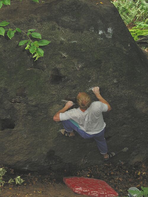 Mezi nejhezčí a zejména nejoriginálnější věcičky patří určitě "No Hand", který i přes svůj velmi trefný název vede stropem. Nočník je snad nejhezčí šutr, který jsem na bouldrování viděl. Leze se po převážně slušných chytech, které jsou však daleko od sebe a ty stupy! Flaying boy je jeden z nejbláznivějších skoků, který je po několika pokusech sám o sobě schopen člověka pěkně vyždímat, vedle toho "Orbit" je ultraoriginální snad dvacetimetrový traverz po oblé hraně, jehož vyčištění dalo pořádně zabrat. Projekty označené "víc než 8" budou skutečné perly bouldringu. Kdo rád lišty, zařádí si v kolmici na Nejťáku, silové lezení ve stropě nabízí Delfín, ačkoli Pinožení je poměrně zdatný technický prstolam. Je tu prostě všechno, momentálně asi osumdesát hotových kusů + potenciál na projekty. Celkově se v petrohradských lesích skrývá určitě kolem tisícovky směrů, z nichž zhruba dvě stovky jsou hotové. Přeji hezké polezeníčko a až se bude chtít projít, zavítejte na sousední kopec, tzv. Bránu, kde najdete další desítky panenských šutrů.