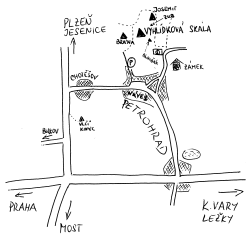 A jak se sem dostanete? Petrohrad je malá víska nedaleko Kryr v jižní části Lounského okresu. Od křižovatky silnic Praha-K.Vary a Most-Plzeň jede motorizovaný lezec asi 3 kilometry směr Plzeň (Jesenice) a odbočí doprava přes Chotěšov do Petrohradu. Ze jmenované křižovatky je též možné pokračovat na K.V., dojet do Petrohradu, z hlavní sjet doleva a asi po 2 km dojet (stále po hlavní) na náves. Z petrohradské návsi asfaltovou silničkou od zrcadla, přijíždíme-li z Chotěšova, je to v zatáčce doleva, do kopce až na její konec. Někde po cestě zaparkovat, ideální je rozšíření v lese, popř. již na návsi. Na konci asfaltky doprava dobře vyšlapanou cestičkou do lesa, nejprve hustým, posléze vysokým lesem až téměř na vrchol. Vpravo jsou viditelné balvany Vyhlídkové skály.
