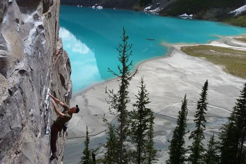 O to více lidí se potom sbíhá na nepříliš rozsáhlé útesy přímo za jezerem, které jsem si opravdu oblíbil. Jednak díky neobvyklé skále, kterou je ostrůvek křemence uprostřed jinak vápencových Rockies a také díky nádherným výhledům na modré jezero. Lezení je tu jak sportovní, tak tradiční, i když převážně jednodélkové. Křemencová skála tvoří velmi zajímavé útvary, od kapes a různých boulí, až po ostré lištičky ve stěnách nebo přímé spáry – vše však ve velmi pevné a kompaktní skále. Nevýhodou je počet lezců, kterých tu zejména o slunečných víkendech je přespříliš. Další nevýhodou je cena ubytování. Kempy v národních parcích Kanady jsou od $30 na den a místo pro stan. Skvělou alternativou by byl pokoj v nádherném hotelu Chateau Fairmont, který stojí hned na moréně jezera a pokoje se dají pronajmout už od $500 na den.