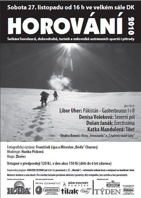 Setkání horolezců, dobrodruhů, turistů a milovníků extrémních sportů i přírody. Denisa Voleková: Severní pól, Libor Uher: Pákistán - Gasherbrumn I+II (již v 16 h !), Ondra Beneš: Venezuela, Alpy – Císařovy nové šaty, Katka Mandulová: Čína, Dušan Stoupa Janák: Erectissima.