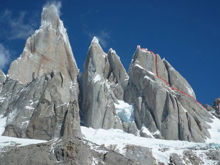 Cerro Torre, Torre Egger, Punta Herron a Cerro Standhardt a značená linie cesty Exocet.