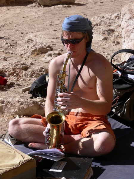 Ondra Beneš relaxuje při hře na saksofón