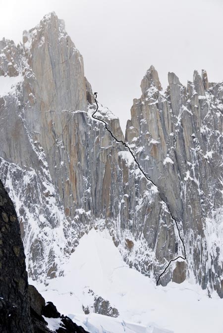 Na jaře 2010 vysoloval Colin Haley na Aguja Mermoz už zmíněnou Argentine Route (600m, 6a+), viz video dole.
