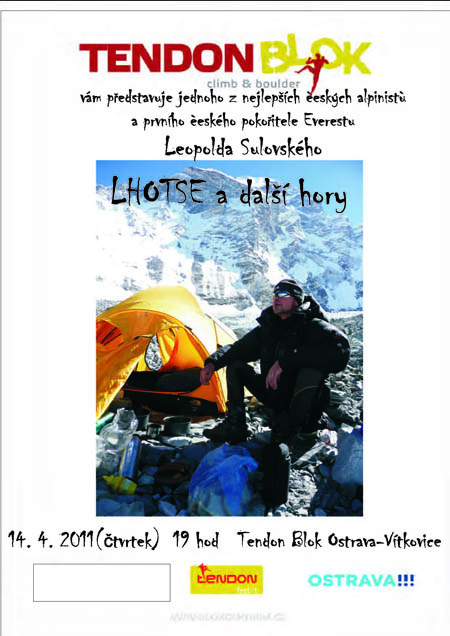 Přednáška a projekce známého  horolezce Leopolda Sulovského, prvního českého pokořitele Mt. Everestu se uskuteční  dne 14. dubna v 19 hod v lezeckém centru Tendon Blok v Ostravě. Všichni místní  i přespolní příznivci jsou srdečně zváni!!
