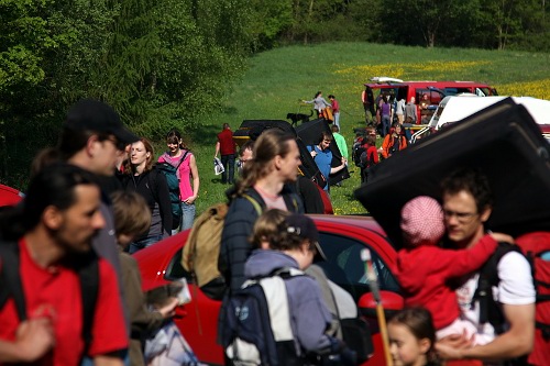 Přesto, odhlédnu-li od prapodivné nálady na téma pořadatelské problémy, za kterou si můžu sám, protože jsem ještě nedospěl do fáze státnického nadhledu a klidu, si dovolím subjektivně říci, že Petrohradské padání 2011 rozhodně zase celou akci posunulo dál. Minimálně jeho lezecká část a vůbec vše, co se pobytu v lese a jeho nejbližším okolí týče. Nebyly tu největší lajny, nebyly tu nejtěžší prásky, ale byl tu prostor. To, co já osobně na přírodním boulderingu miluju nejvíce. Hezký les, nejlépe v rovině, rozházené „bobky“, kde se nestojí fronty a mezi nimiž je tolik prostoru, že sebou můžu plácnout do trávy nebo mechu a vnímat všudypřítomné jaro. K tomu mi napomáhejte třeba houfy přátel Ferdových, zejména v oblasti „Divadýlko“. Ač akci řádně narostla, připomnělo mi lezení v některých částech začátky s několika desítkami lezců. Kdyby se nám tak tenhle směr podařilo udržet! Navíc dole na květinové louce stánek s výborným masíčkem na grilu, pívečko nebo gulášek („já jsem tvé stáří, pozvi mě dál“).