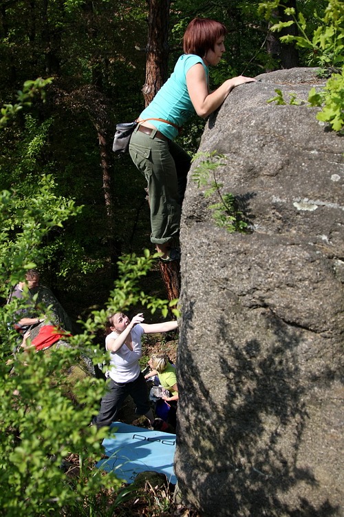 Řada lidí si pojí bouldering s výkonem, s atmosférou tlaku, s atmosférou povyku, razení, hecování. I ti se snad dočkali, ačkoli některé projekty prostě nešly a jiné prásky byly téměř trvale obsazené. Do met nejtěžších se logicky pustil zejména Adam Ondra. Nejprve pomocí extrémně pohyblivého zápěstí malinko zlehčil projekt „Fakír SD“ za 8B, posbíral pár osmiček, m.j. lehčí 8A „Kometa II“, která nově startuje z chytu přímo pod hranou, a pustil se do „nastřílených“ hrůz. Zejména linka z údolní strany Perníkové věže by si přelezení zasloužila, leč ještě nějaký čas projektem asi zůstane. Nereálně se tváří i SD nástup k „Lištonošovi“ na Rosťově, zato strop v „Kůlně“ hned pod Kometou by mohl jít! Tak snad až bude lepší tření. Z těch největších výkonů se nelze nezastavit minimálně ještě u Agnieszky Ostrzalek, která utvořila ženský rekord „padání“, když získala 1740 bodů zejména díky dvěma 7C a „Růžovému kavalírovi“ za 7C+. Trochu jí akorát vyděsila výhra v podobě maglajz pytle UFO BAG plného desetikorun, které jí v Polsku nikdo nevymění. Tak jsme jí museli „odlehčit“. A ještě na skok u žen a dívek – kdo je lepší u Majzlíků, mamka nebo dcera? Docela bych chtěl vidět, jak to dělali v praxi, ale vylezli prostě absolutně identické bouldery, m.j. jedno 7C.