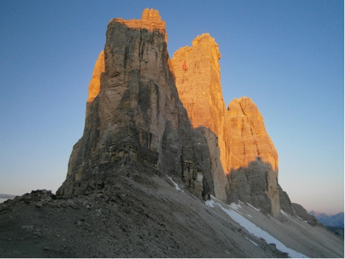 Skupina Tre Cime při východu slunce, šipkou je označený nesprávný sestupový směr Irů