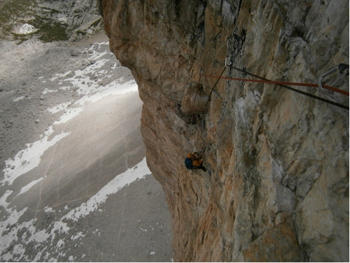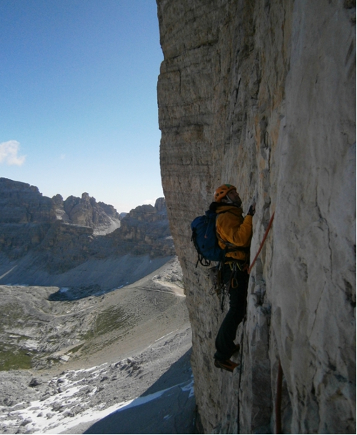 30.6.2011 jsme vyrazili s parťákem do naší téměř domovské oblasti Tre Cime di Lavaredo v italských Dolomitech. Jako cíl na další den jsme zvolili Diretissimu  Hasse/Brandler VIII+ (VI+ ,A2) 19 délek, vedoucí v severní stěně Cima Grande. Do cesty jsme nastoupili následující ráno v 7:00 a kolem půl šesté večer jsme už hledali začátek slanění /sestupový komín- jediná slabina jižní stěny, tvořené jinak příkrými policemi s větším množstvím uvolněných kamenů/.
