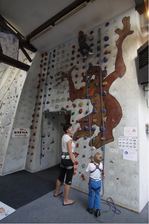 Chyty vyvinuté pro děti, připravená top rope lana, stěny s dětskými motivy, rajbasy.