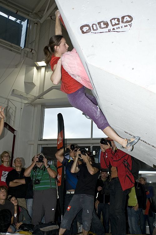 Finalisté měli trochu ztížené podmínky jednak vzdálenou izolací a jednak chybějící rozlezovkou, ale nakonec to všichni zvládli bez nějakého většího remcání a začalo finále holek. Na prvním bouldru, technické protlačovačce, se holky hýbaly nejvíc a padlo tady nakonec krásných šest TOPů. Dále stavěči prověřili holčičí sílu na dvojce, schopnost skákat na trojce a držet obliny na čtyřce. Nejlépe se s finálem poprala Peťa Růžičková a se čtyřmi TOPy na devět pokusů zaslouženě vyhrála před druhou Karolínou Nevělíkovou a třetí Danielou Kotrbovou.