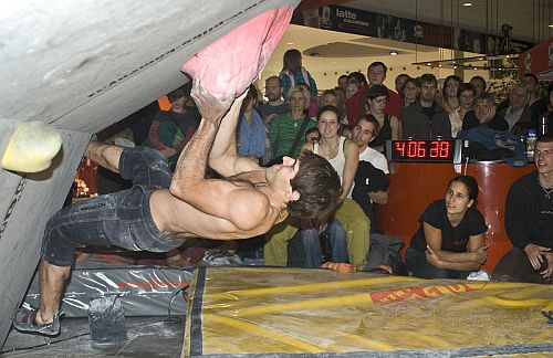 Nastala krátká pauza na přemontování chytů a mohlo začít chlapské finále. Diváci pěkně povzbuzovali a tak kluci odhazovali trička a podávali maximální výkony. I tak ale byl poznat rozdíl mezi špičkou závodního pole a zbytkem finálové dvanáctky. Na aspoň jeden TOP si sáhli jenom tři závodníci, zbytek rozřadily zóny a pokusy na ně. Celý závod těsně vyhrál Martin Stráník před Honzou Chválou o pokusy na TOPy a s třetím místem se musel smířit Ondra Nevělík.