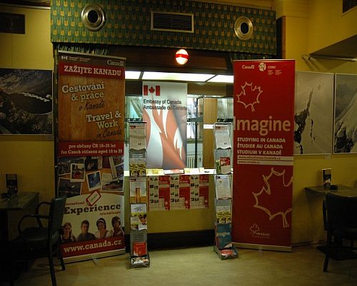 Během přestávek bylo možné navštívit v kavárně Lucerna stánky našich partnerů – stánek kanadské ambasády, Člověka v Tísni a stánek SkiTrabu, kde byly k dostání také trika s logem a motivem Banffu.