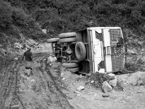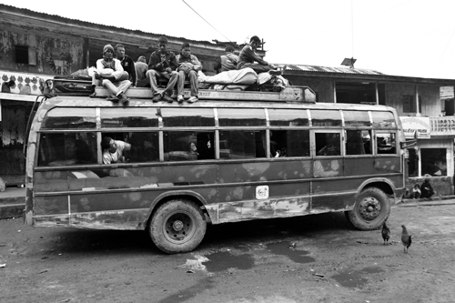 Z pozemní cesty jsem byl odrazován, Vašek Pátek mi ji přímo nedoporučil. V Lonely Planet k tomu napsali: „Masochists might consider travelling overland to Taplejung, though the 150 km road from Ilam is diabolical. This route is impossible after rain and not really recomended at any other time“. Překladu asi netřeba. V Nepálu jsem jel autobusem mnohokrát, ale to zcela předčilo mé očekávání. Opravdu pro masochisty. Po letošním zemětřesení v Sikkimu byla dopravní infrastruktura hodně poškozena. Zda to se to projevilo i na této cestě, nemám informace. Ale tvrdí hošci z Čech a Moravy, jak poznamenal Branko vydrží všechno, tak se i nám podařilo naše tělesné schránky dopravit do Taplejungu.