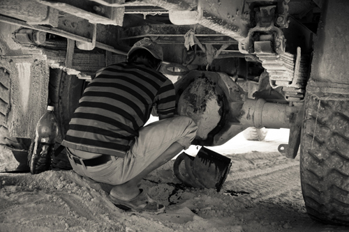 Jízda našeho autobusu skončila hned v další zatáčce. Upadla mu zadní osa. To moc opravit s taškou nářadí nelze.