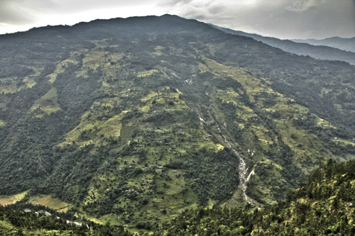 Obávám se, že tady by se už posral strachem. Na dřívější stroj nebo spoj (autobus zní moc honosně) jsme nesehnali již lístky. Sráz pětiset metrů k řece nejde na fotografii vidět. Všichni himálajští bohové stáli při cestujících, protože nikdo při nehodě nezemřel.