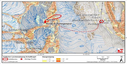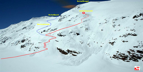 výstupová trasa, která vede přes Kleinleitenferner k Schalfjoch a odtamtud na vrchol Schalfkogel. Skupina oproti tomu zahýbá, viděno ve směru výstupu, doprava a tím volí přímou a tím částečně i extrémně strmou cestu k vrcholu. Byla to pouze neznalost, nebo hrála roli střídavá nebo špatná viditelnost a nebo se jednalo o kombinaci obou možností? Otázka, která se již nedá zodpovědět... Jedno je ale jisté, počasí se během túry výrazně zhoršilo. Pravděpodobně je to také důvod pro to, proč byla túra v nadmořské výšce cca 3 250 m n.m. v oblasti malého narovnání přerušena. Zcela náhodou, díky střídající se oblačnosti, může chatař z chaty Langtalereck tuto oblast od chaty pozorovat a skupinu tam rozezná mezi 15:00 až 15:30 naposledy. Krátce po 16:00 hodině může spatřit bezprostředně pod tímto místem velký odtrh laviny.