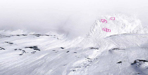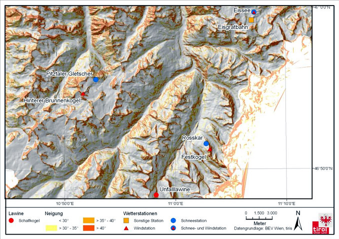 Kde: Schalfflanke – Gurgler Ferner / nadmořská výška odtrhů 3 180 m / nadmořská výška oblasti nánosu 2 800 m / VSV - svah / 40° a strmější (částečně prostoupené skalami)