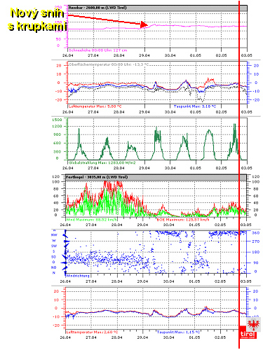 „Dopoledne nabízí slunečno především ve směru Severotyrolského Oberlandu a jižní strany Alp ... Odpoledne všeobecně zesilující přeháňky nejdříve v severních vápencových Alpách, později dosahující až k hlavnímu Alpskému hřebenu, možná bouřka, hranice sněžení 2 000 m n.m. Teplota ve 2 000 m n.m.: 0 –5 °C, ve 3 000 m n.m.: -4 °C. Vítr na horách: lehký až mírný východního vítr.“
