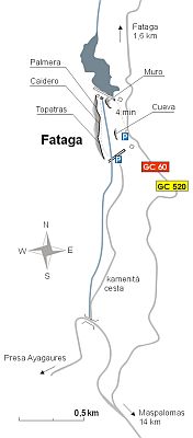 Ze San Fernando de Maspalomas, vydáme se na Centro de Salud. Poté, co jste projeli Aquasur se odbočí vpravo na (GC504) k Ayagaures. Po 11 km přijedete do vesnice Ayagaures. Na hrázi se na silnici dáte doleva a po 1,3 km přijedete na k nádrži de Gambuesa. Nechte své auto u lomu, vedle malého domku (s nápisem aqua na stěně). Pěšky asi 15 min podél nádrže až k jejímu konci pak ještě kousek a za chvíli už uvidíte cesty vlevo.