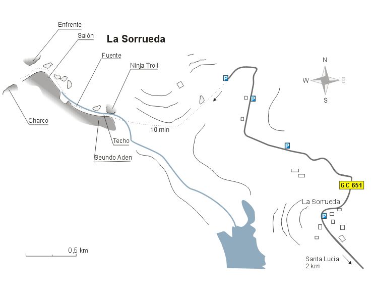 Vydáme se Arinaga a pak směrem do vnitrozemí do Santa Lucia. Těsně předtím, než se dostanete do Santa Lucia minete La Presa de Sorrueda (přehrada) na levé straně, jeďte však až tou další, která je značená na La Sorrueda. Okolo hřbitova (po pravé straně) po klesání ostrá odbočka doprava do vesnice La Sorrueda. Dál přes tuto malou vesnici, kolem domu s pavlačí na polní cestu. Máte-li 4x4, můžete pokračovat až na konec cesty, když ne je lepší zanechat auto asi 200 m od středu vesnice a pak jít asi 1 km pěšky dolů na dno kaňonu.