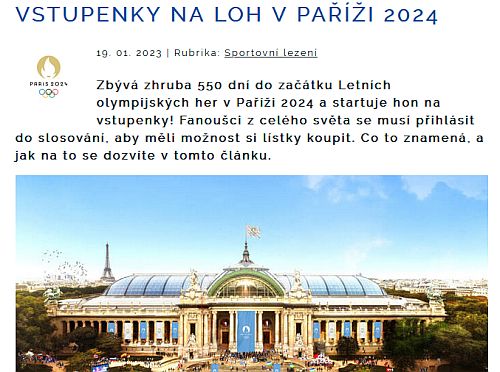 ČHS upozornil zájemce, kteří chtějí na Letních olympijských hrách v Paříži 2024 sledovat na místě osobně sportovní lezení (stejně jako ostatní disciplíny), musejí se do konce tohoto ledna přihlásit do slosování o možnost si lístky vůbec koupit. ... celý článek
